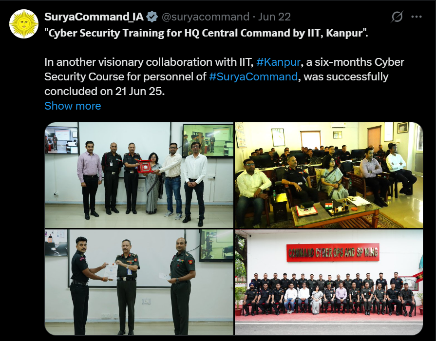 In an official statement on X, HQCC (@suryacommand) added, “This training is a testament to the growing synergy between the Armed Forces and leading academic institutions, crucial for meeting demands of #futurewars. The comprehensive curriculum designed to equip the participants with advanced skills, will foster a dedicated pool of cyber warriors for resilient cyber defence.”